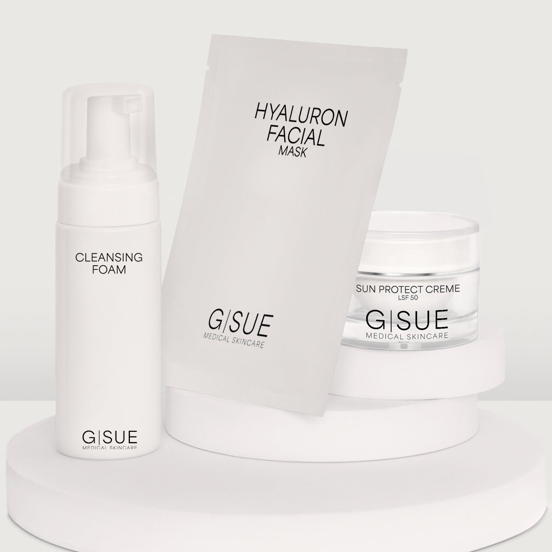 Die Sun Protect Cream täglich, der Cleansing Foam morgens und abends, die Hyaluron Facial Mask nach Bedarf (z. B. nach langen Sonnenstunden).